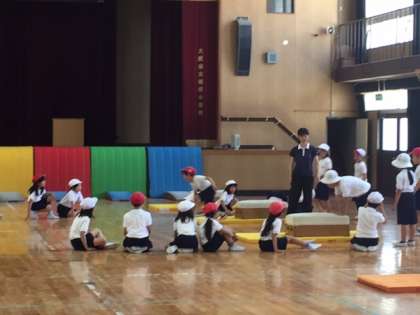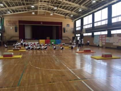 跳び箱を使い、リズムに合わせて上手に前転をしています。