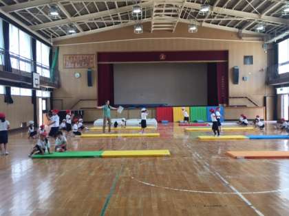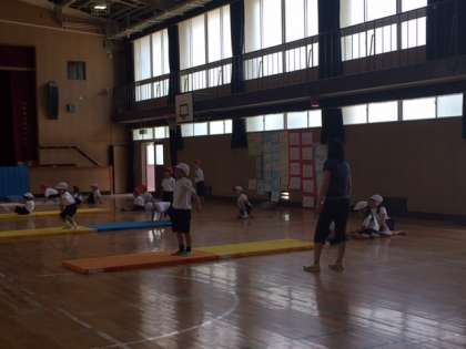 講堂(体育館)でマット運動しているクラスとグランドで走りをしているクラスがあります。どの子も元気一杯に活動しています。今日は、気候も良く、運動がやりやすい日でもあります。集中して取り組んでください。