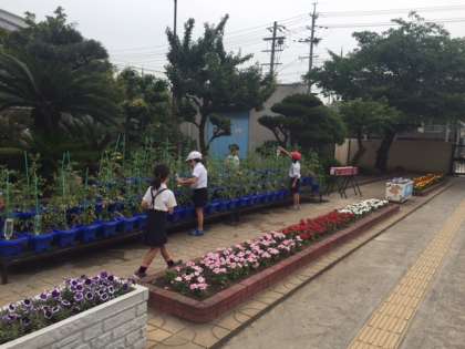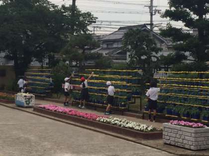 子どもたちは、心をこめて「アサガオ」や「ミニトマトに」水やりを行っています。