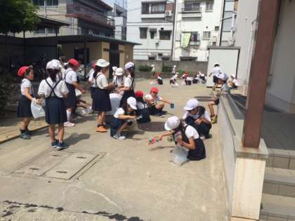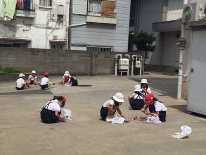 太陽の光を、色をつけたプラスティックの容器等で観察しています。