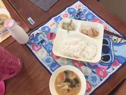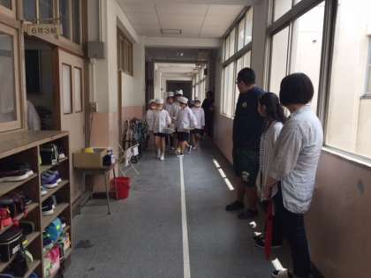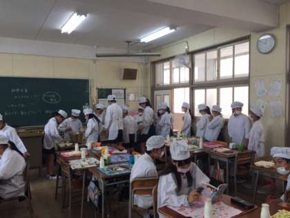 9月から始まる親子給食に対応するために、横堤中学校の先生が、月曜日から3日間、来校されました。児童の役割分担などを、じっくりと見学されていました。子どもたちは、中学校の先生が来られて、若干緊張していました。