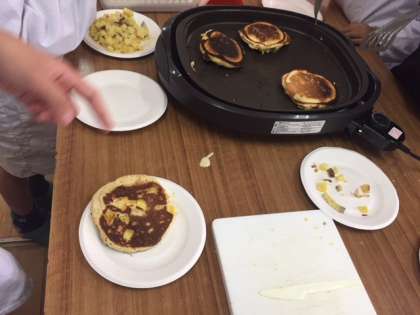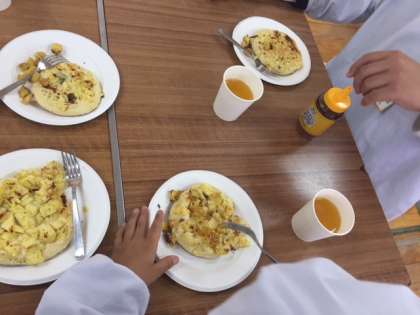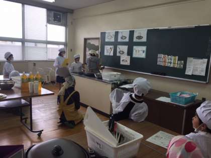 学習園でとれたサツマイモを使って、かんたんな調理をします。1年生から6年生までのたてわり班で力を合わせて「サツマイモホットケーキ」をつくります。