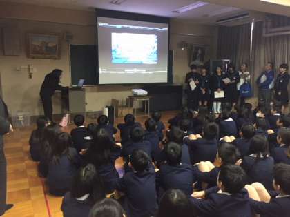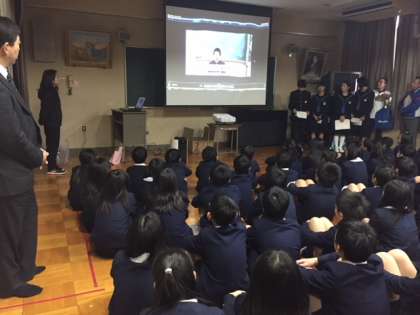 横堤中学校の生徒が来校し、中学校の紹介を6年の児童にしました。