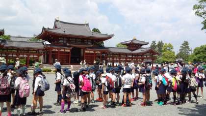 十円玉と見比べる子供たち。「あっ、おんなじだ!」今日は5年生が宇治・平等院に遠足に行ってきました。今日は外国からのお客様も多く、「ハロー、グッドモーニング」と声をかける児童に「Hi! Morning!」と気さくに返してくれ、子ども達は大喜び。平等院見学の後は、天ケ瀬ダムの方へハイキングです。ところが季節は春!毛虫や尺取虫が地面を我が物顔に這っています。見つけるたびに「キャーッキャーッ、ワーワー」子ども達の歓声が響き渡ります。う〜ん、こんなに虫嫌いで、林間学校は大丈夫かな?とは担任の先生たちの声でした。