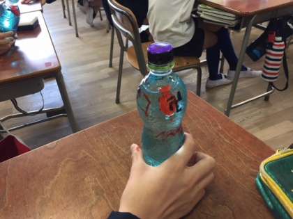 パスカルの原理を利用して、ペットボトルのなかの「物体(魚型のしょうゆさし)」を浮き沈みさせます。