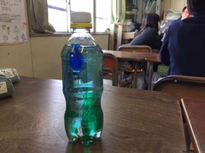 力を加えることで、圧力が加わり、「しょうゆさし」が、水中で上がったり、下がったりします。
