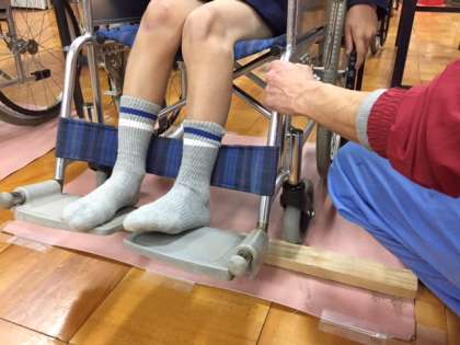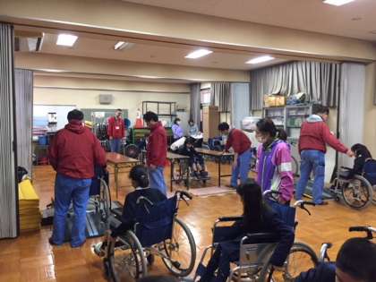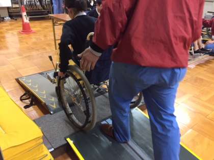 多目的室で、段差やコーナーをつくり、車いすに乗って体験しました。
