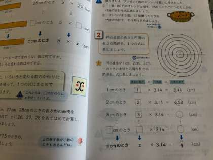 直径をx、円周をyとしてxとyの関係を式で表します。