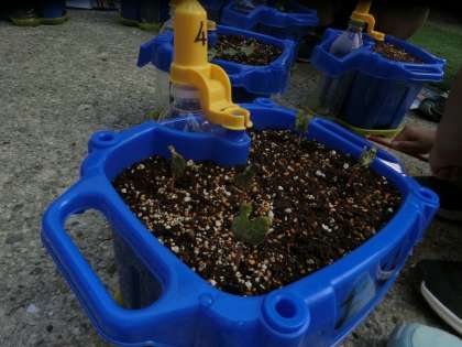 先週の木曜日に植えたあさがおが、早くも芽が出ました。