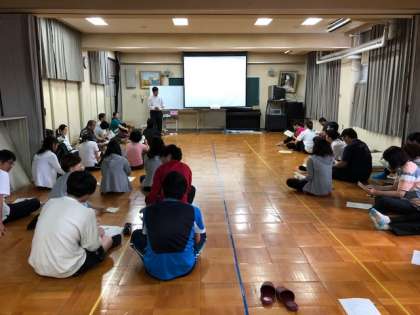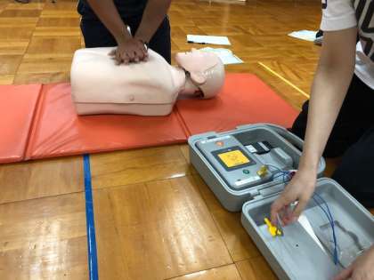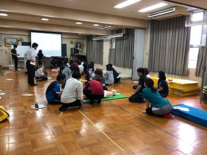 胸骨圧迫(心臓マッサージ)、AEDの使い方など研修し、全教員が正しい応急処置ができるようにしました。