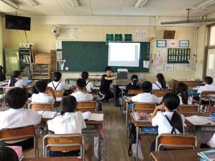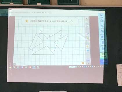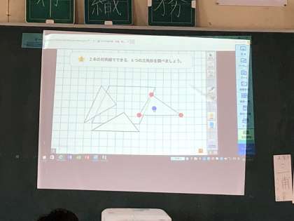 授業では、図形が重なることをICTを活用した授業を行っています。