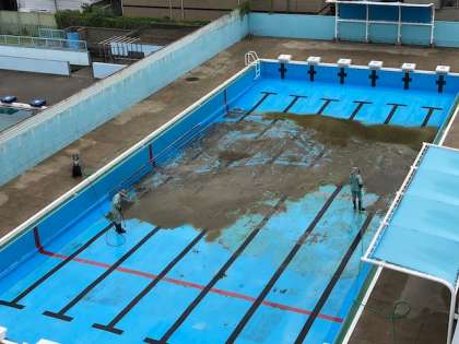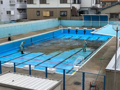 小雨の中、先日から、管理作業員さんが子どもたちのためにプール清掃を行っています。楽しい水泳の学習が、もうすぐ始まります。