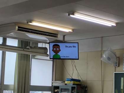 DVDを活用し、児童は、音楽やリズムに合わせて英語を学習しています。