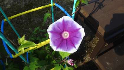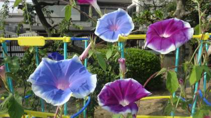 1年生が大切に育ててきたあさがおの花が満開です。「せんせい、6個も花咲いたで〜」毎朝お水をやりに来る1年生との会話です。「せんせい、花しぼんでしもた」「そうか、でもここに種ができるから、来年も咲かそな」「へぇ〜、ここに種ができるのん」また一つ、新しい発見がありました。