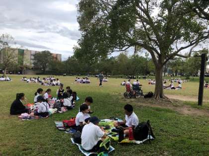 天候は、曇りです。暑くなく、風が心地よく、過ごしやすい状態で、昼食をとれています。