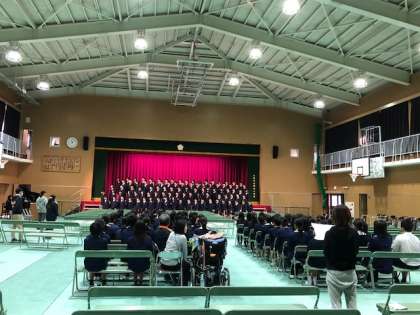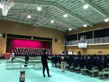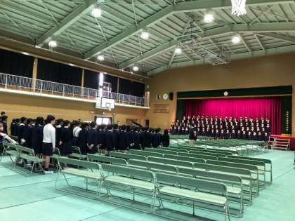新しい講堂で、5年生と6年生が合同で卒業式の練習をしました。