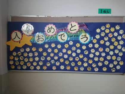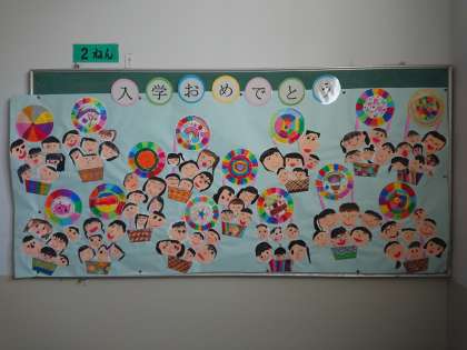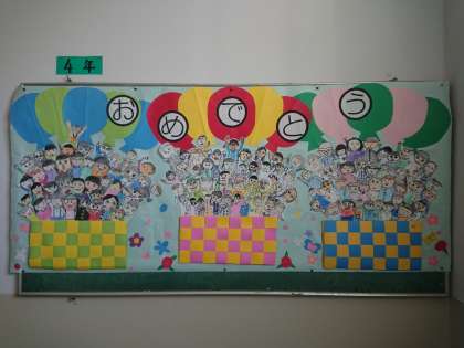 階段には、各学年が作ったお祝いの作品が掲示しています。