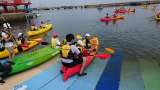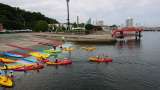 9:25 海上プログラム「カヌー」2 出航準備中です。 カラフルなカヌーが並ん...