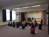 1年生が講堂で、跳び箱に挑戦しています。 助走して、しっかりとタイミングをとり踏...