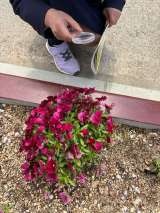 午前中の出張から戻って正門を入ると、たくさんの3年生が、虫眼鏡を片手に何やら観察...