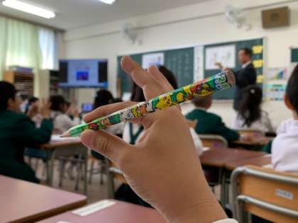 1年生に正しい鉛筆の持ち方を教えていただきました。これからは、正しい姿勢で、正しく持って丁寧に書いていくことと思います。