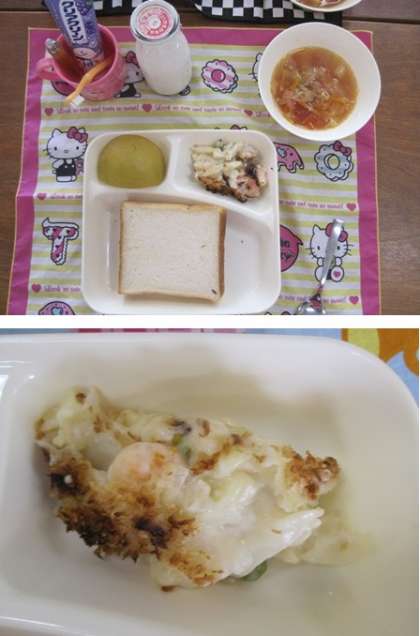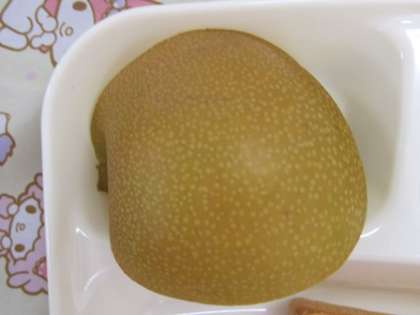 今日の給食には「豊水」という品種が出ています。350〜400gほどになる大きめの赤梨で、幸水と並んで生産量が多い品種です。1972年品種登録されました。日持ちがよく、果肉はやわらかで多汁。甘みの中に適度な酸味があります。店頭に並ぶのは8月下旬頃からです。