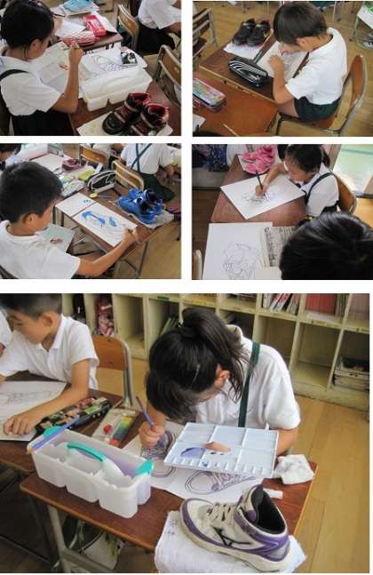 ペン書きが終わった児童は、絵具で色をぬっています。