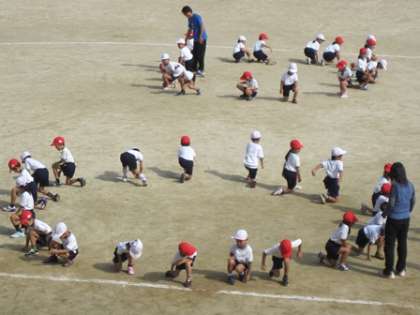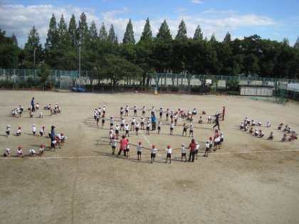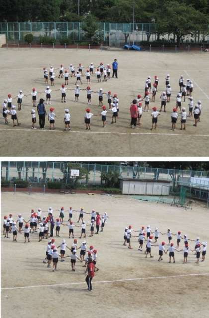 運動場で円を作っていました。各クラス2つずつの円を作ったあと、1年生が座ってポーズ?をとるタイミングに合わせて、2年生がクラス2つだった円を1つにして小さな円から大きな円にかわっていました\(^o^)/