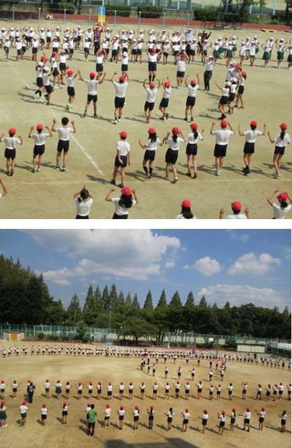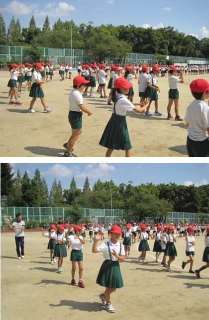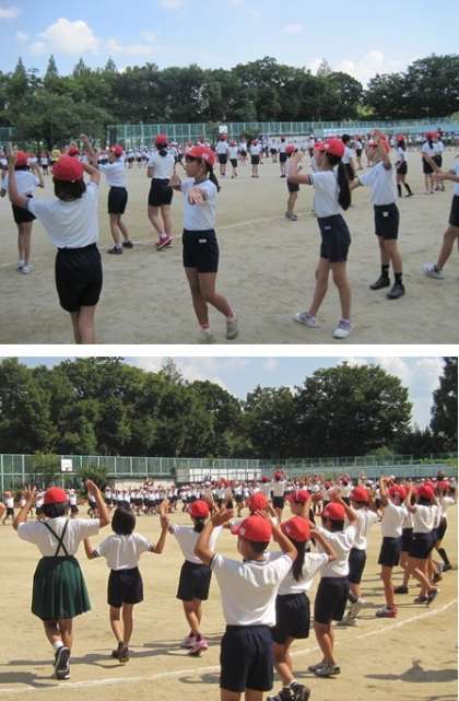 2回目の鶴見音頭全校練習です。2時間目が終わって、鶴見音頭練習開始の放送が流れると、前回確認した位置に、児童達は素早く並ぶことができていました。