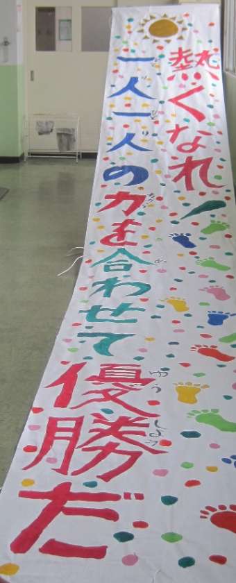 情報委員会の児童が協力して運動会のめあてを書いた垂れ幕を作りました。