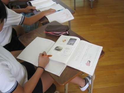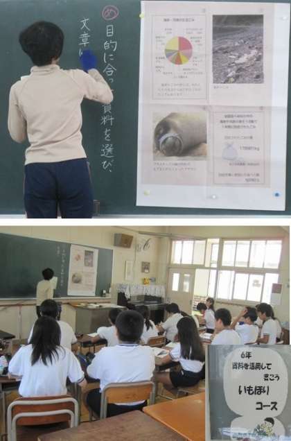 「資料を活用して書こう」という単元で資料を効果的に使って文章を書く学習をしています。教科書に載っている4つの資料の中から必要だと思うものを選び文章を書いています。