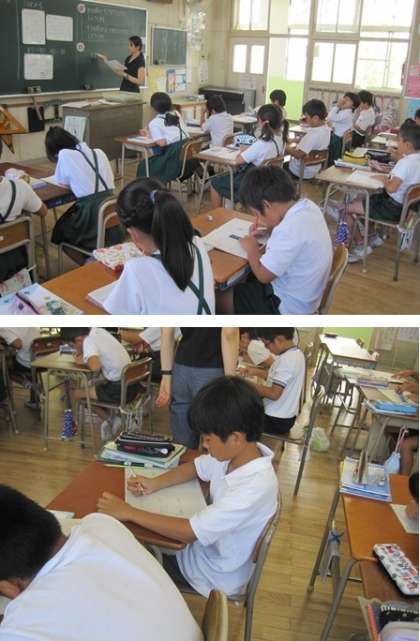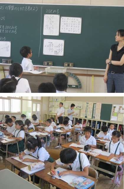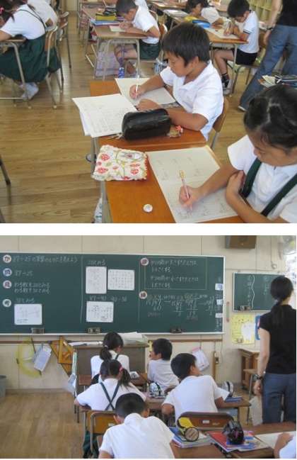 算数の続きです。発表ボードに書いた自分の考えをみんなの前で発表しています。