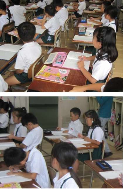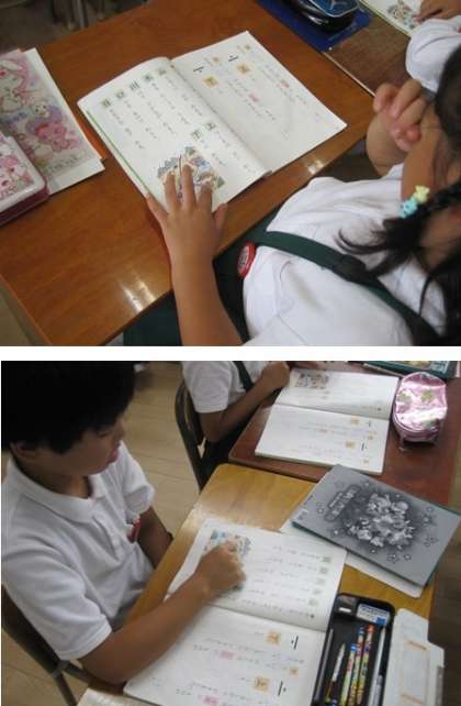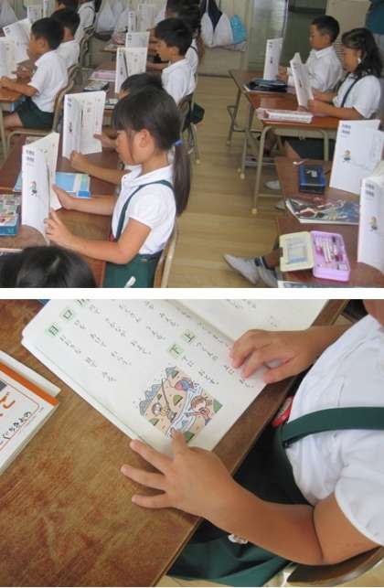 教科書の挿絵を見ながら、例文を確認し、そのあと、先生が提示した絵を見て、1年生の児童も文づくりをしました。