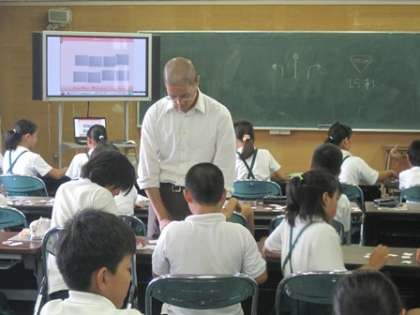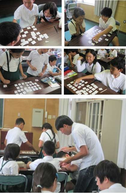 今日は、Hi,Friends!の45ページにある絵カードを使って「神経衰弱」のゲームをしていました。カードをめくるたびに、赤丸なら「Red circle」というふうに英語で答えながらゲームをしていました。