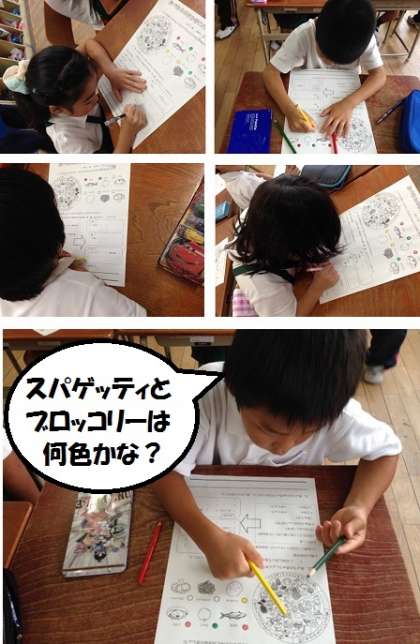 プリントに書かれた表を参考に、食品を赤、黄、緑に色分けしていました。