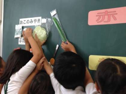 授業が終わった後、黒板に掲示されたフードモデルに興味津々の子どもだちが早速さわりに集まっていました(笑)