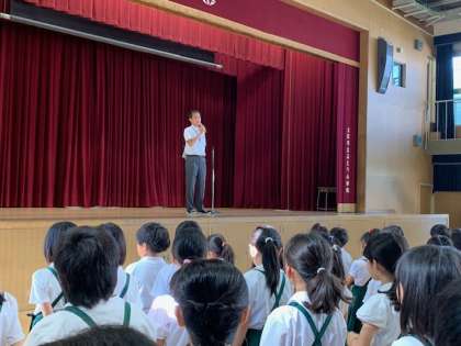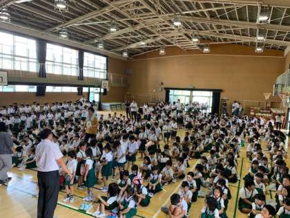 講堂に集合して始業式を行いました。新しいお友達の紹介や表彰がありました。