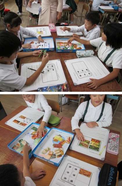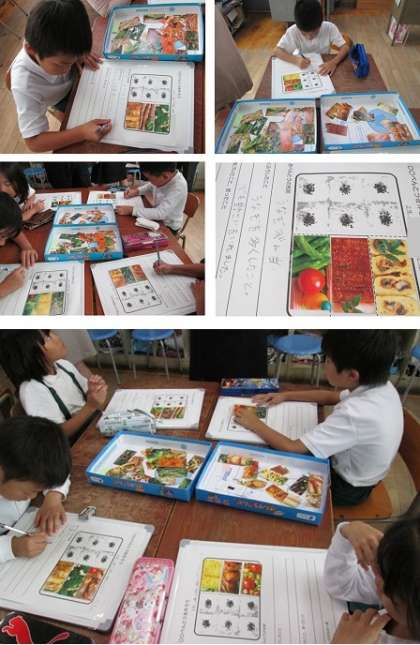たくさんある「おかずカード」からお弁当箱につめるおかず3品をみんなでたのしく選びました。赤、黄、緑の栄養のバランスに気をつけながら 熱心におかずを選んで、○○弁当の○○に思い思いの名前をつけていました。