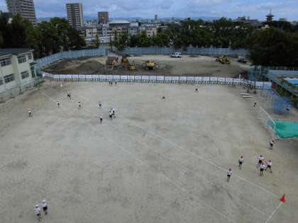 それに伴いまして、授業等での運動場使用につきましては、しばらくの間、北側の西部コミュニティ広場を使用することになります。尚、西部コンミュニティ広場の仮設グランドですが、工事車両経路等の関係で狭くなるとの連絡を受けております。