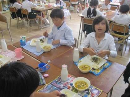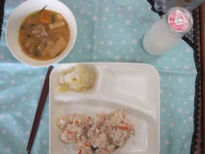 かやくご飯の「かやく」は、花火に使われている「火薬(かやく)」ではなく、いろいろな具を加えるという意味の「加薬(かやく)」からつきました。今日のかやくご飯には、鶏肉、にんじん、三度豆、しめじが入っています。
