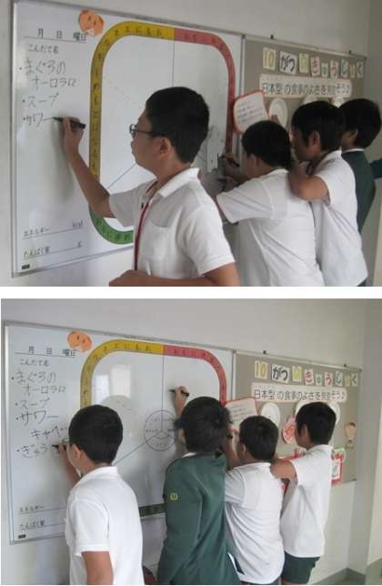 写真、3枚目、4枚目は栄養黒板に月曜日のこんだてを書き込んでいる、金曜日当番の児童です。