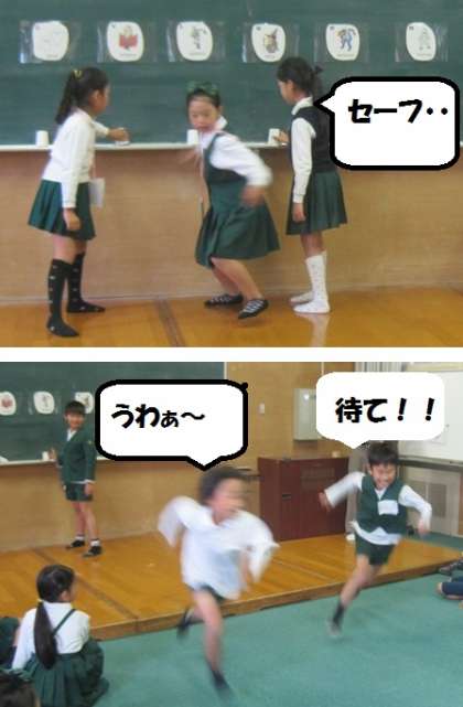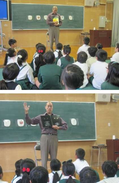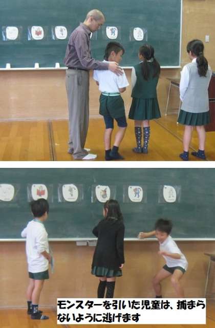 楽しくゲームをした後は、絵本(ビッグ グリーン モンスター)を使っての勉強です。エディーが読むのに合わせて、色や大きさ、数、目、口、鼻などの言い方を練習しました。