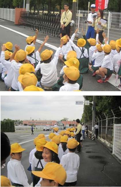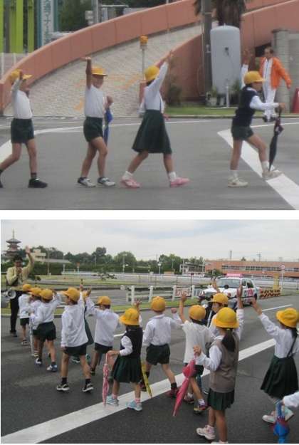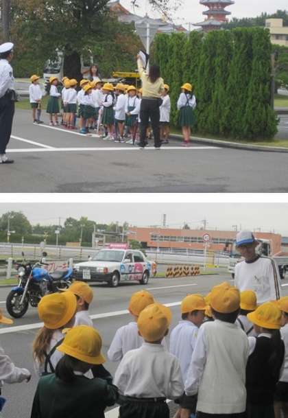 最初、自動車学校の先生が話をしてくださり、その後、自動車学校の中の道路を歩着ました。