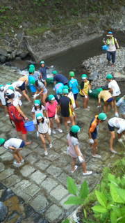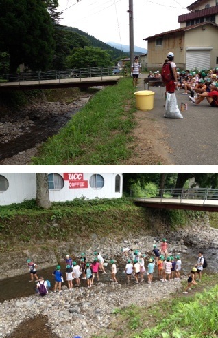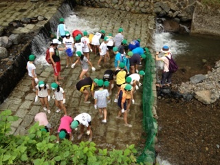昼食が終わって、宿舎近くの川で魚つかみをしました