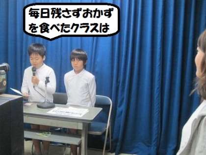 校長先生の話のあと、給食員会の児童が先週行われたパクパク週間の結果発表と給食委員会からのお願いを言いました。