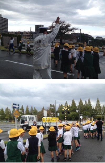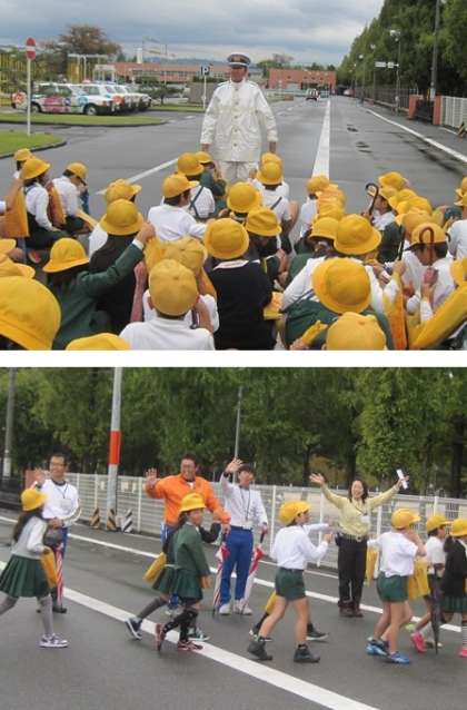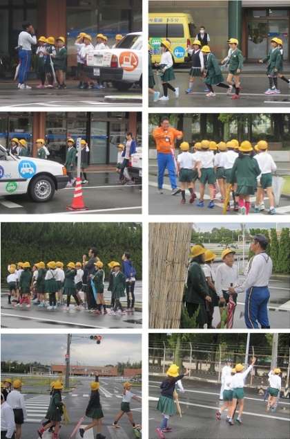 3、4年生の児童は、坂道での見通しの悪さや、色によって遠くでもよく見える色とみえにくい色があることを教えてもらいました。