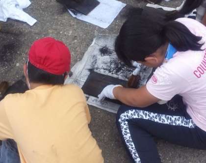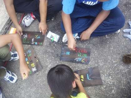 気持ちを込めて 思い思いの言葉を板に書き込んでいました。