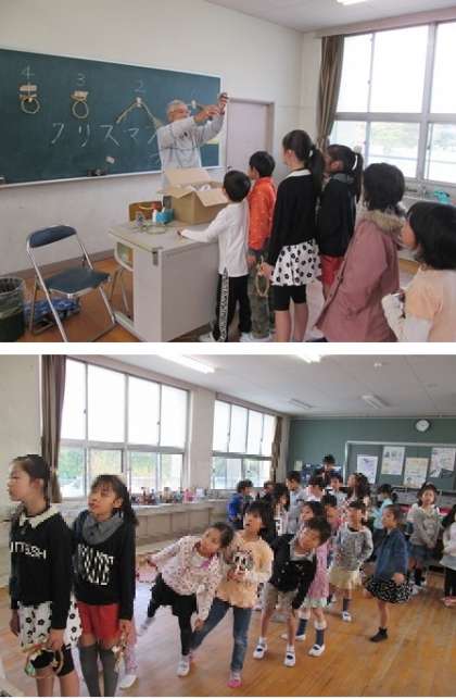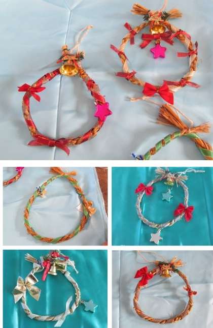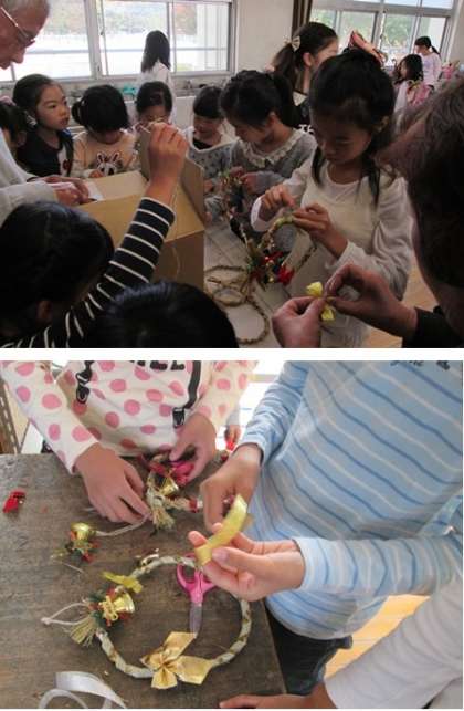 縄がなえた児童は、きれいな赤や緑色のリボンや星などを使って、クリスマスリースを飾っていきます。