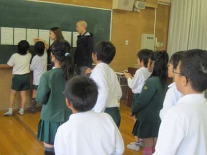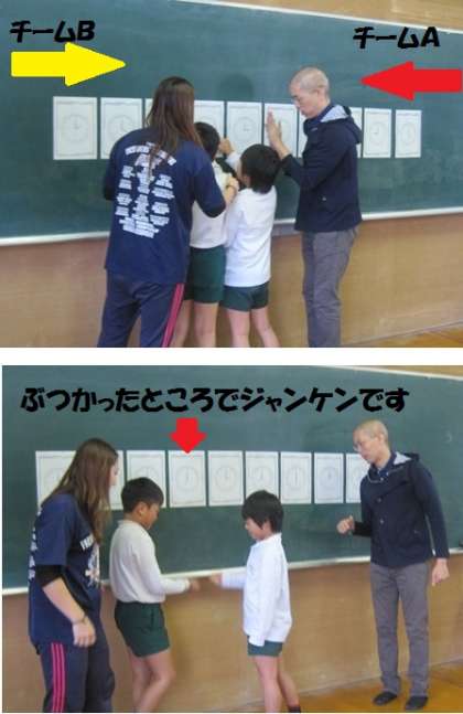 時刻を言う練習を何度かした後は、チーム対抗のゲームです。学級を2つのグループに