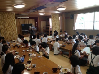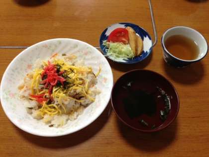 ちらし寿司、ワカメのすまし汁、フライドポテト、トマト、キャベツです。